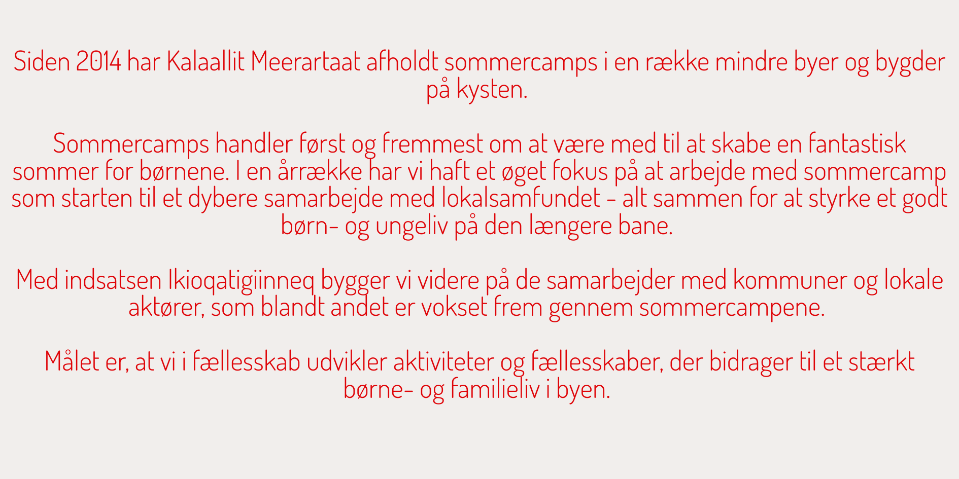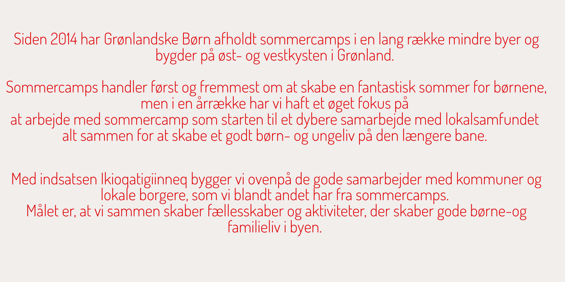 Til sommer kommer Narsaq til at summe af liv og aktiviteter, når frivillige fra hele verden rejser til byen for at lave sommercamp i to uger i sommerferien. Når sommercampen slutter, fortsætter den mere langstrakte indsats Ikioqatigiinneq.